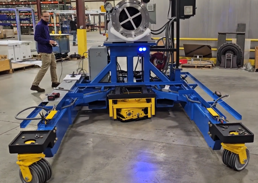 Easterwood’s first task was to program and stabilize a traction differential swerve drive, an omnidirectional drive system. Prototyping with FRC components, Easterwood was able to demonstrate the feasibility and limitations of this drive system for industrial use. While the controllability was limited at higher speeds typically found in FRC robots, Easterwood found that, at the slower speeds typically associated with industrial robotics, he could develop a PID control algorithm that maintained stability. Boeing, an aerospace manufacturing company, showed interest, and so the Halo Drive was born. Boeing utilizes the Halo Drive in their industrial manufacturing space by integrating them into large work stands which drive up to airplane fuselages.